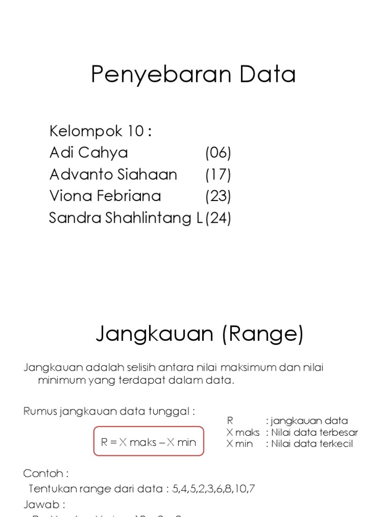 Jangkauan range yang dimaksud jangkauan atau range adalah selisih data terbesar dengan data terkecil dari sekumpulan data. Jangkauan data terbesar data terkecil.